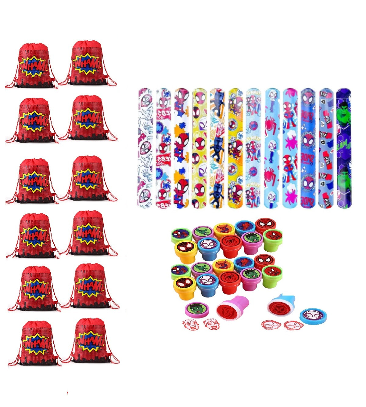 العدد: 12 Superheroes Backpack, 12 Slap Bracelet , 12 Plastic Mask, 24 Mini Stamps